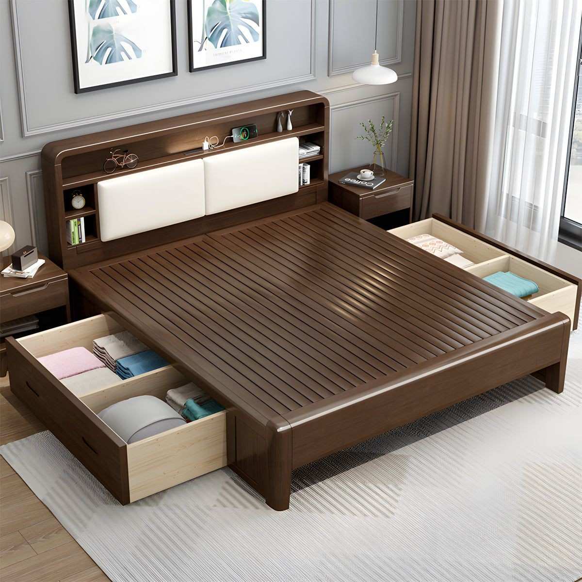 Custom Wooden Storage Bed with Drawer & Lift-Up System