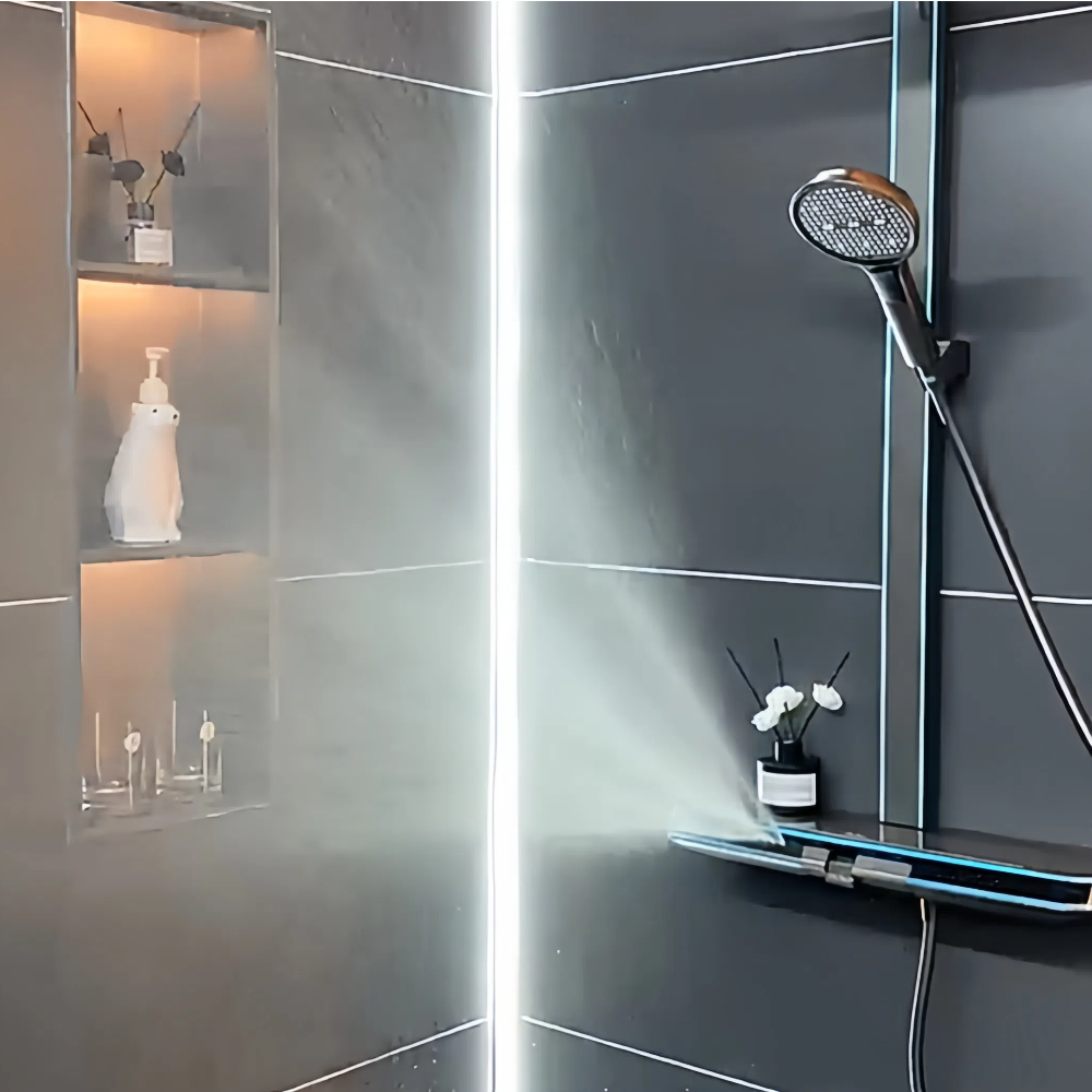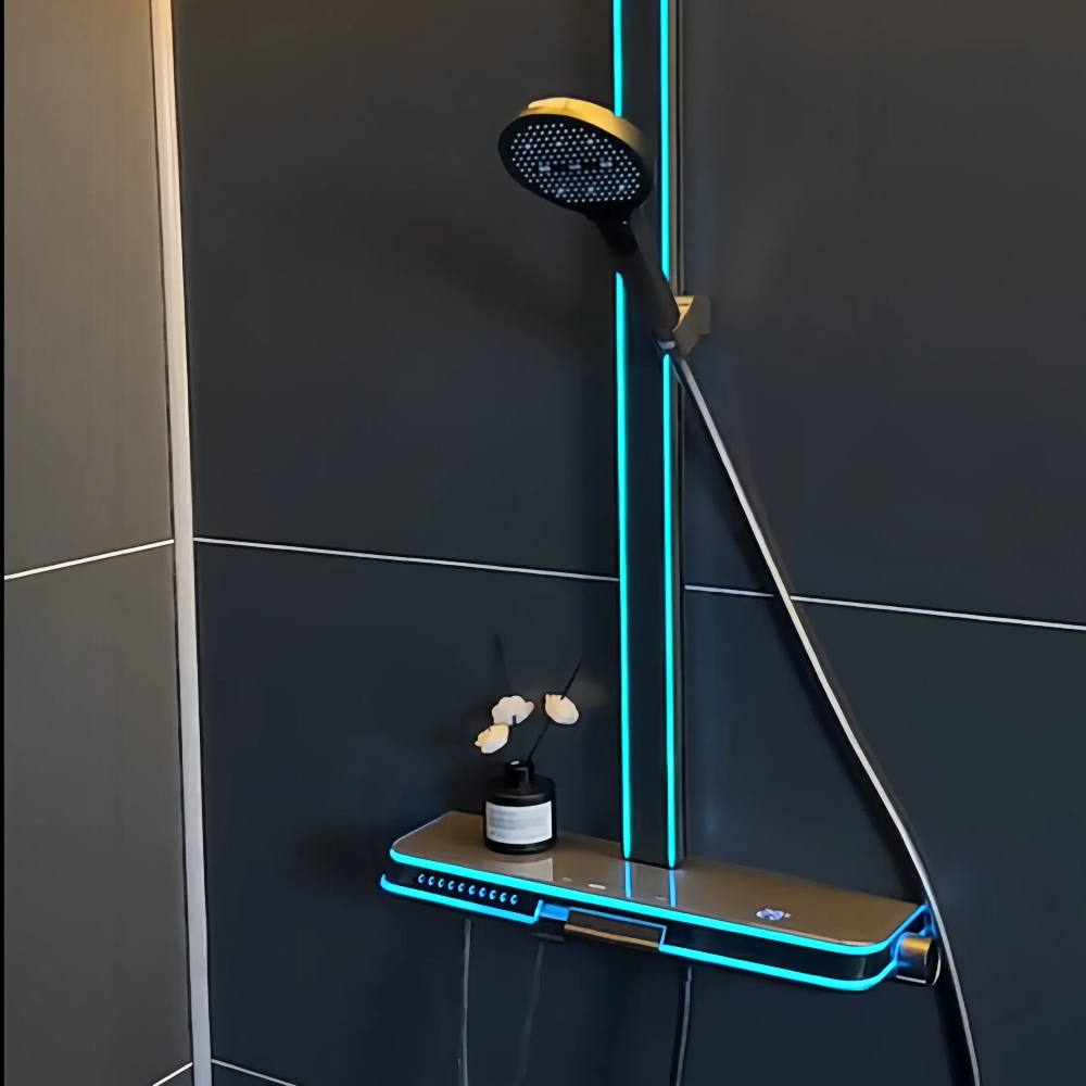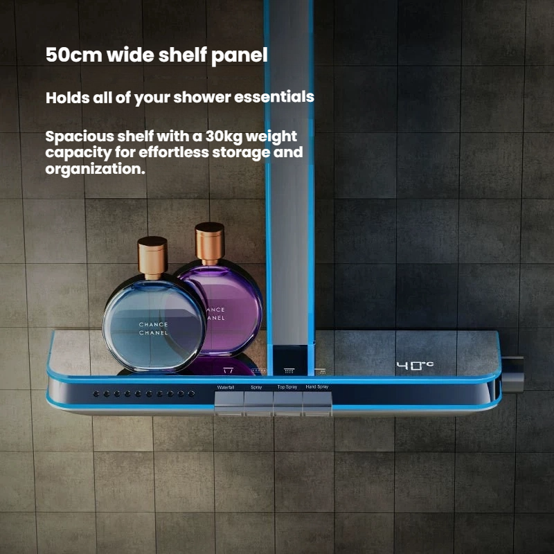 A premium all-in-one smart shower panel designed for modern bathrooms, combining waterfall and rainfall showers, handheld jet spray, massage body jets, LED ambient lighting, and a digital temperature display. Engineered for luxury, durability, and everyday convenience.
